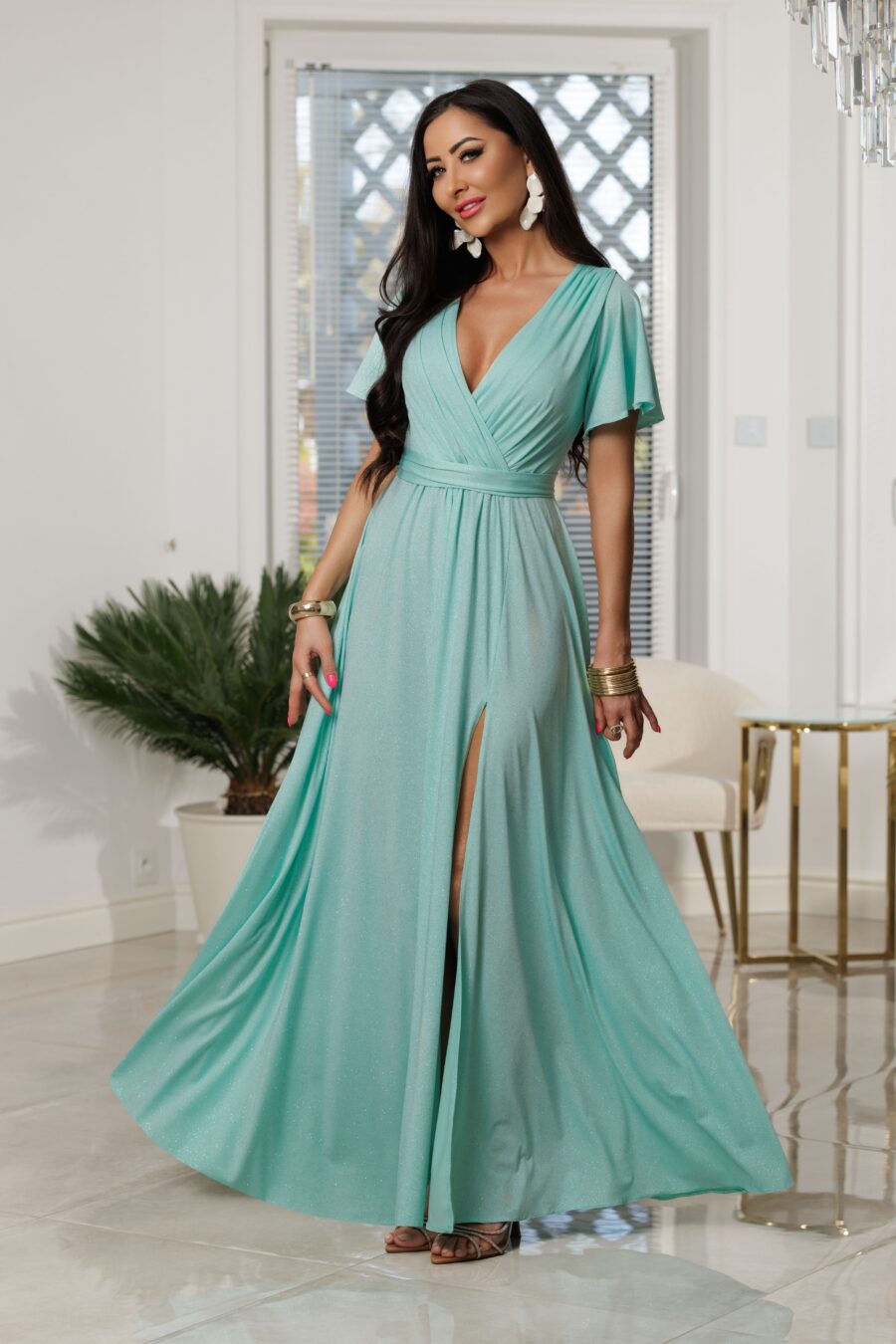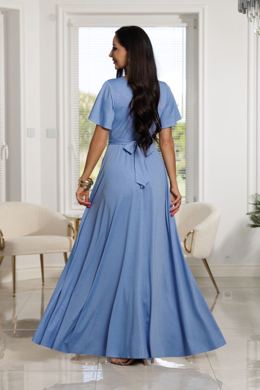 Model Bella – długa sukienka wieczorowa z połyskiem i motylkowymi rękawami