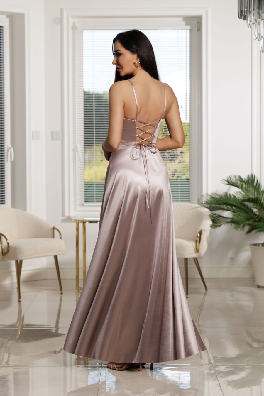 Długa gorsetowa sukienka maxi NATHALIE satyna / Czekoladowy