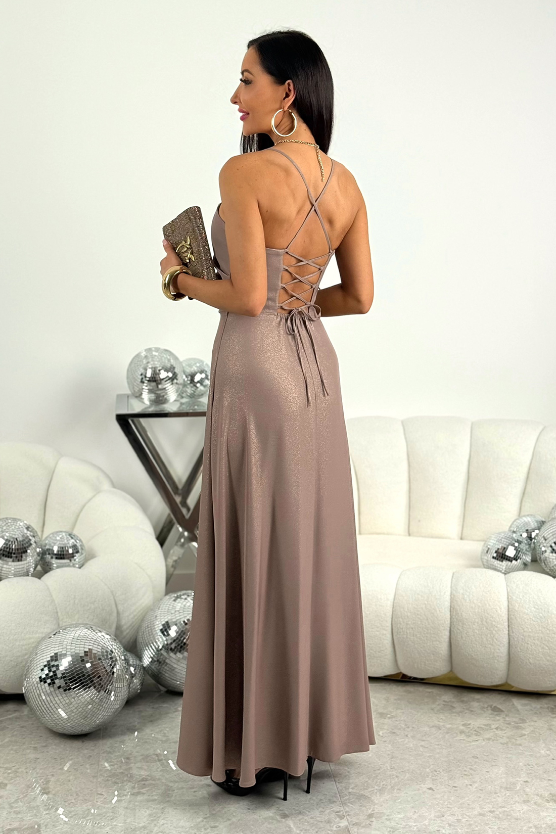 Sukienka maxi NATHALIE na wyjątkowe okazje o rozkloszowanym fasonie. Gustowny model, który pasuje na wesele czy inne okazje. Sukienka ma gorsetową górę z niesamowitym wiązaniem na plecach. Sukienka pięknie eksponuje i wydłuża nogi oraz podkreśla talię. Uszyta z wysokiej jakości tkaniny pokrytej błyskiem. Model odcięty pod biustem co pięknie podkreśla talię.