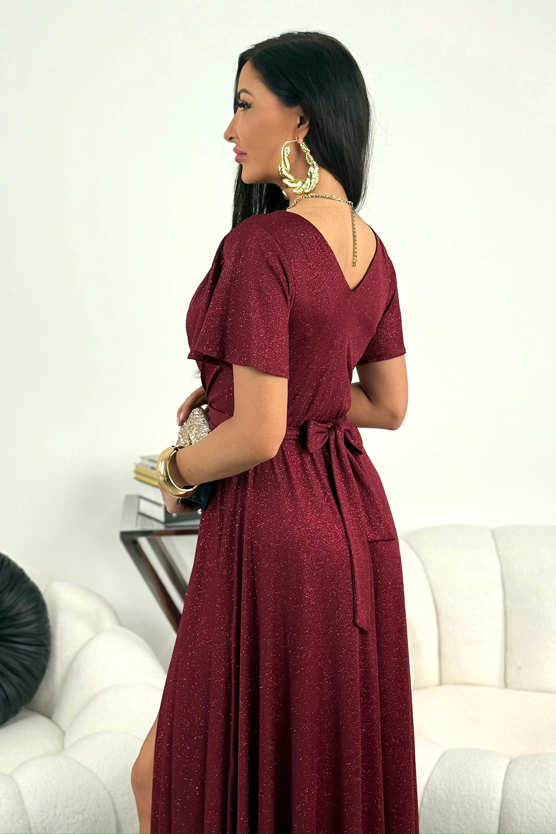 Model został wykonany z dzianiny brokatowej, która efektownie odbija światło i przyciąga spojrzenia. Wiązany pasek w talii optycznie modeluje sylwetkę, podkreślając kobiece kształty i zapewniając komfort noszenia.