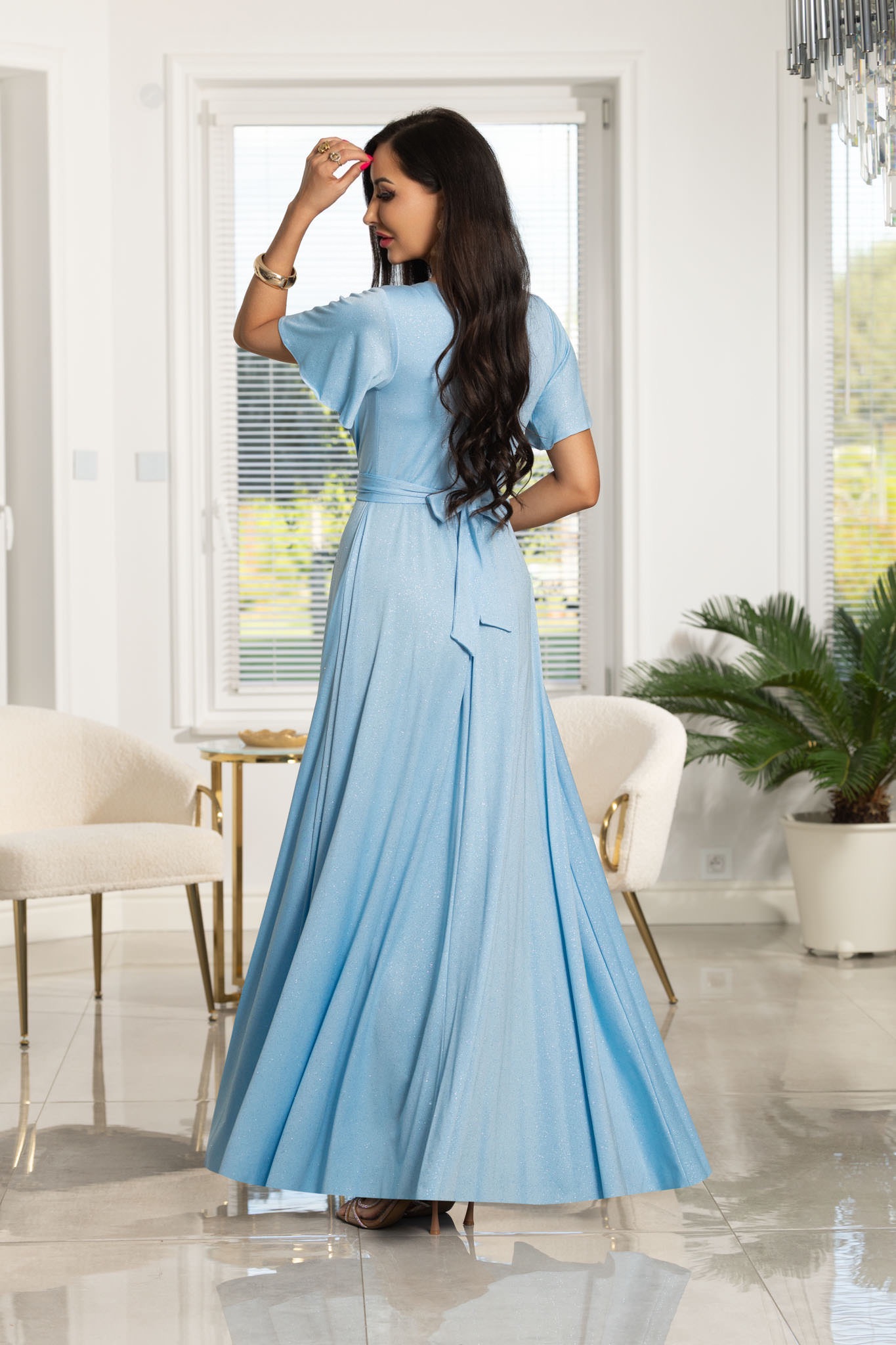 • Model Bella – długa sukienka wieczorowa z połyskiem i motylkowymi rękawami