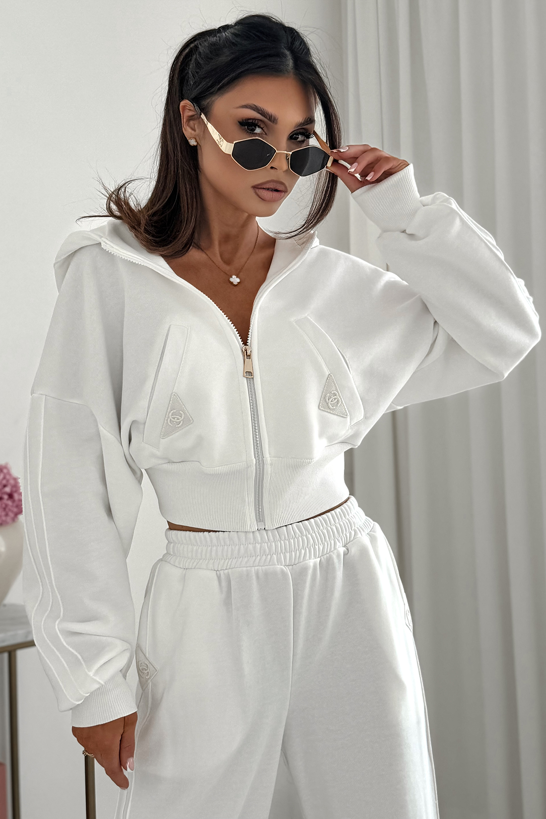 Bluza posiada krótką formę do pasa, dlatego podkreśla sylwetkę i nadaje lekkości całej stylizacji. Jednocześnie kaptur oraz zapięcie na suwak zwiększają funkcjonalność. Ściągacz zapewnia dobre dopasowanie, dzięki czemu całość dobrze układa się na ciele. Spodnie mają luźny fason, dlatego gwarantują swobodę ruchów. Dodatkowo gumka w pasie i przy nogawkach zwiększa komfort noszenia. Materiał 95% bawełna i 5% elastan jest miękki, dlatego zapewnia wygodę przez cały dzień.