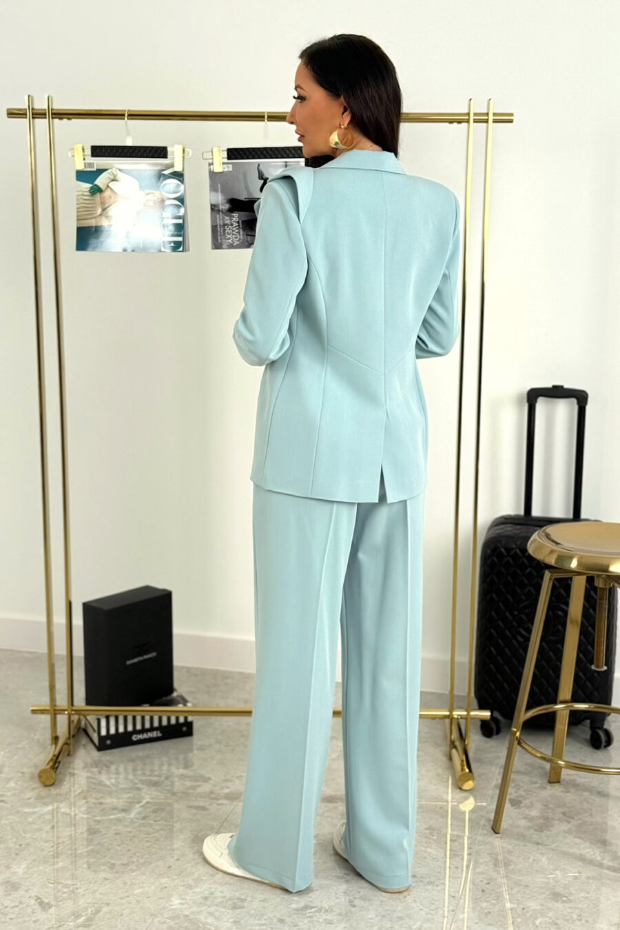 Zestaw składa się z długiej marynarki zapinanej na ozdobny złoty guzik oraz szerokich spodni z wysokim stanem.  Spodnie te pięknie modelują sylwetkę i zapewniają komfort noszenia. Wysoki stan podkreśla talię, wydłuża optycznie nogi i nadaje całości eleganckich proporcji. Dlatego też te cechy są istotnym atutem sprzedażowym w segmencie kompletów damskich.