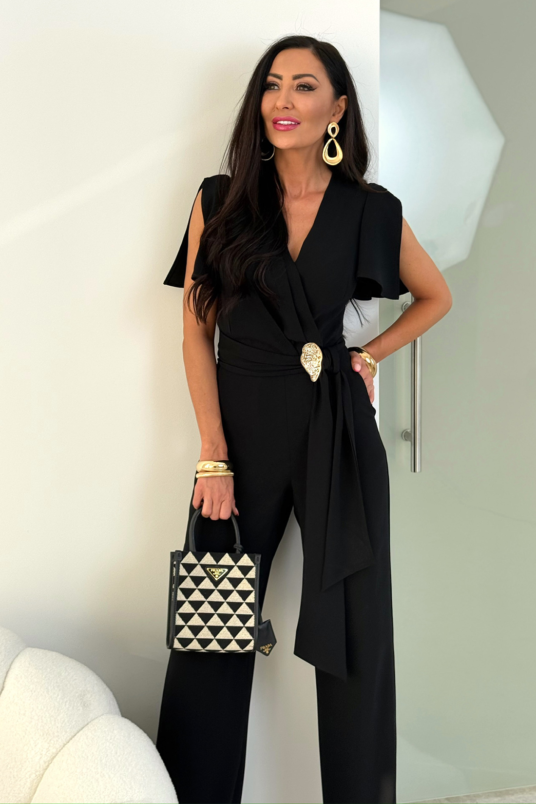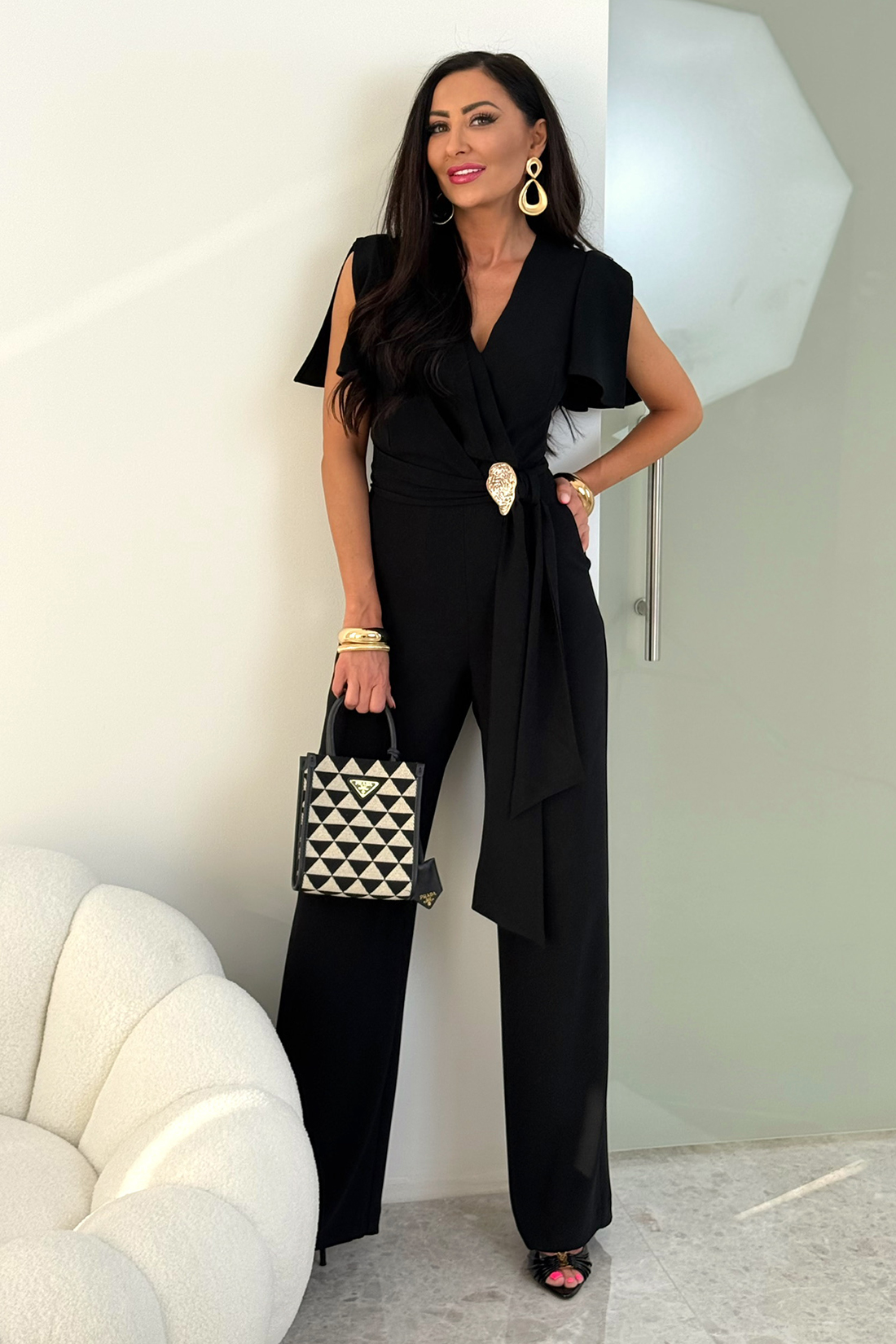 Charakterystycznym elementem modelu TRIS są pęknięcia na rękawkach, które dodają lekkości i subtelnego ruchu. Dodatkowo wiązanie oraz zamek na plecach zapewniają idealne dopasowanie, dlatego model dobrze pracuje na sylwetce. Luźne spodnie z kieszeniami zwiększają wygodę, a pasek z ozdobą podkreśla talię. Dzięki temu całość wygląda elegancko, a jednocześnie bardzo nowocześnie.
