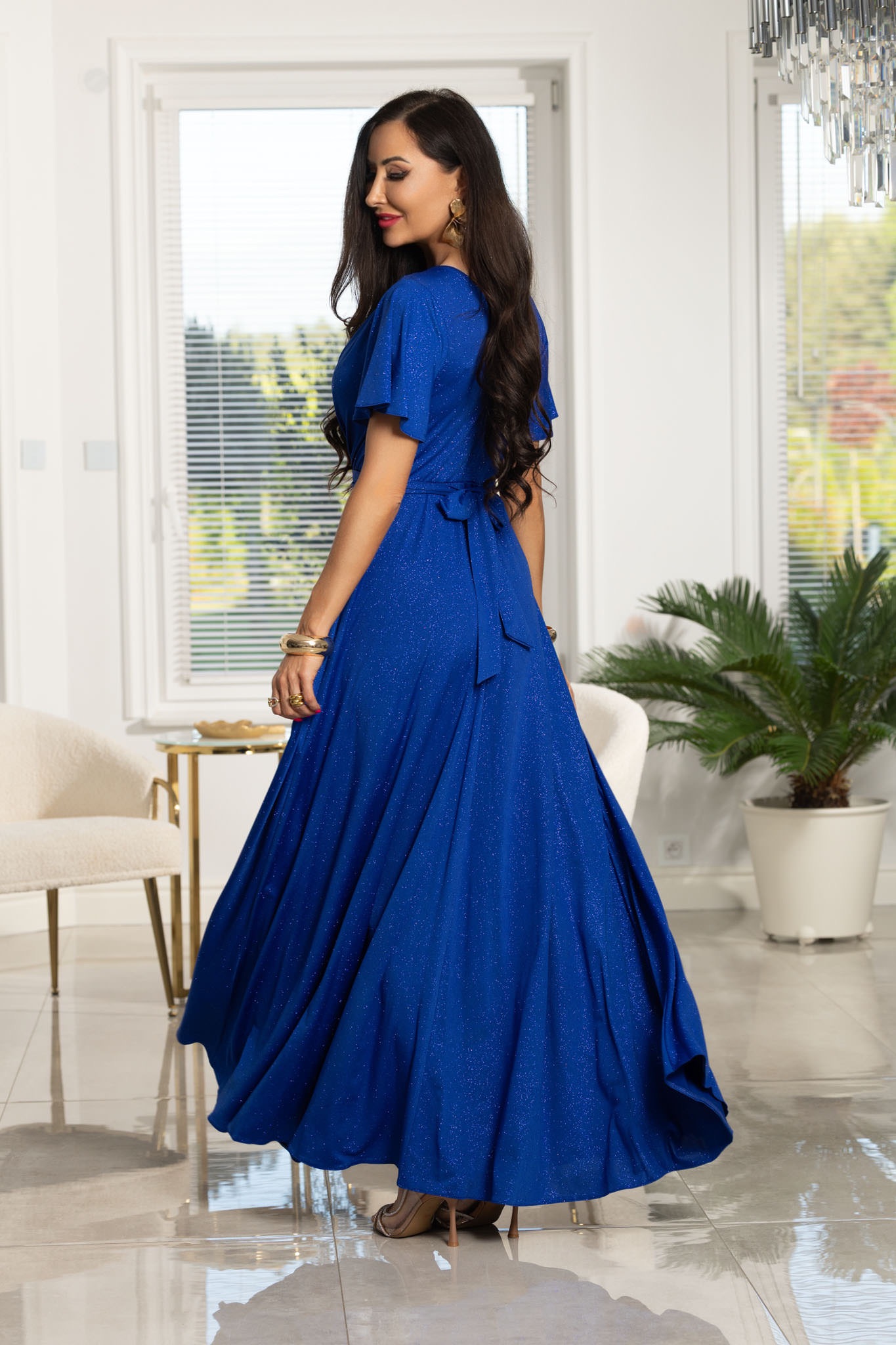 Model Bella ma długość maxi i lekko rozkloszowany dół, co nadaje sylwetce lekkości i klasy. Motylkowe rękawy oraz wiązany pasek w talii delikatnie modelują figurę i podkreślają kobiece kształty. To fason, który pięknie prezentuje się w ruchu – zarówno na parkiecie, jak i podczas zdjęć.