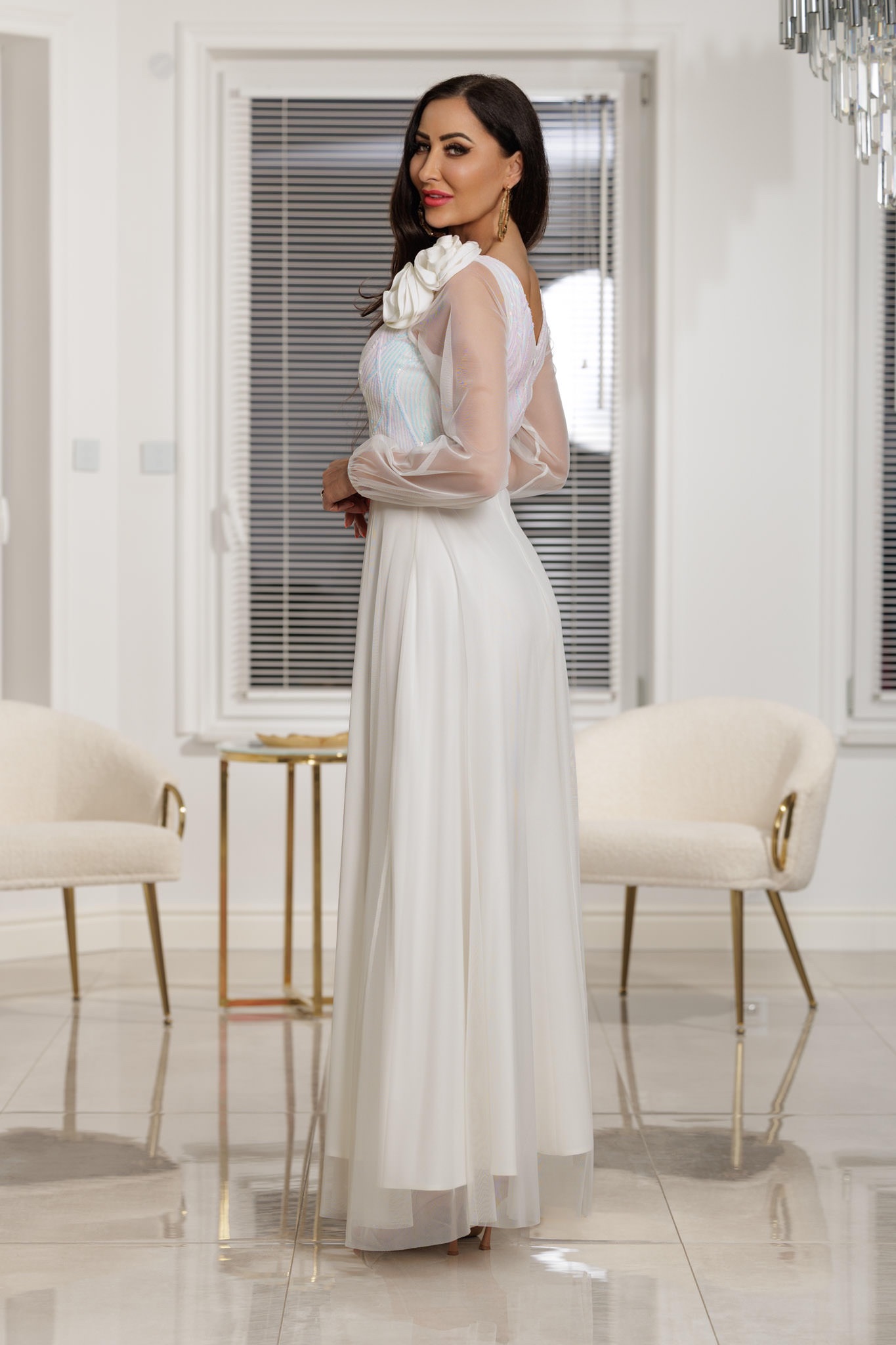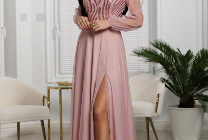 Długa, rozkloszowana spódnica pokryta warstwą tiulu – dodaje lekkości i bajkowego efektu, góra z cekinami – elegancki połysk przyciągający spojrzenia. Długie, tiulowe rękawy – transparentne, zmysłowe i romantyczne. Dopinany kwiat 3D – subtelny, ale efektowny akcent dla podkreślenia kobiecego stylu. Idealna na studniówkę, bal, wesele, galę i inne ważne uroczystości.