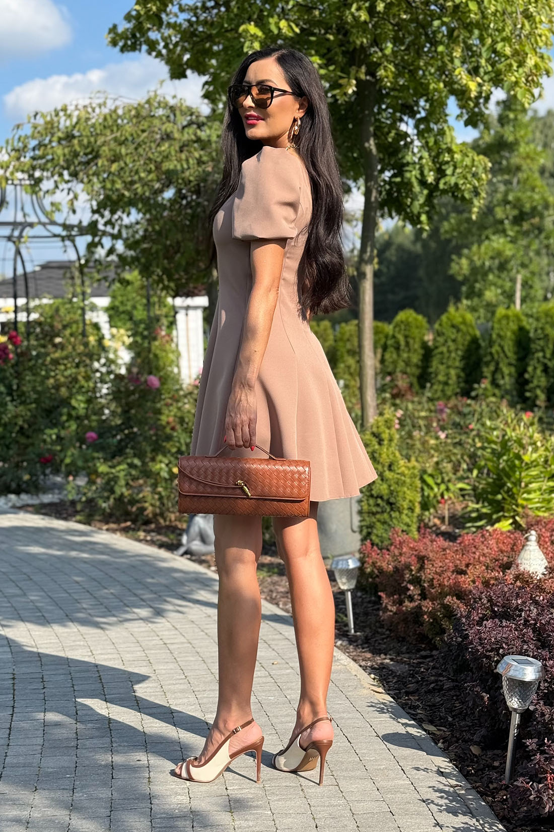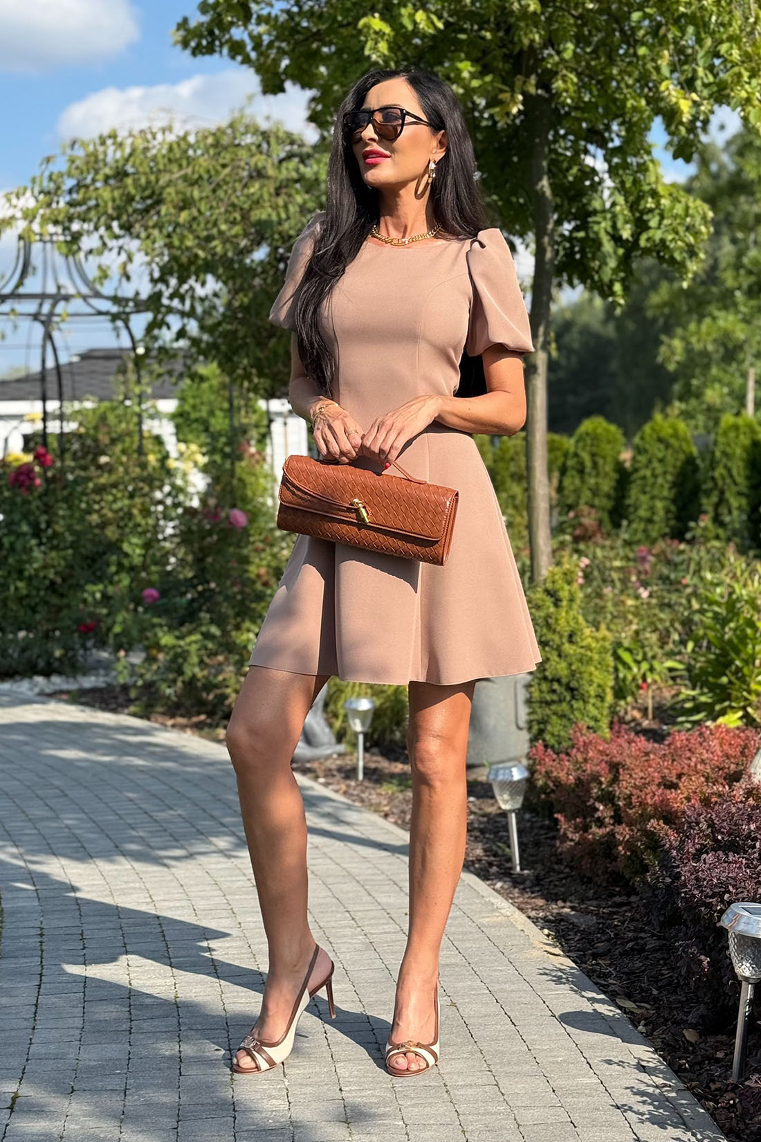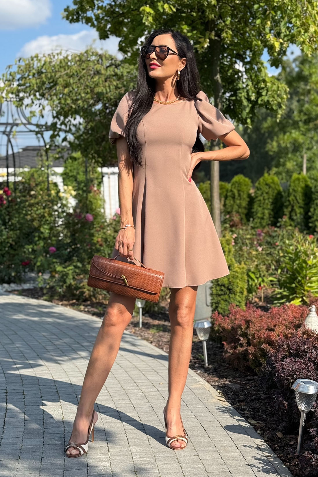 Krótka długość subtelnie eksponuje nogi i dodaje lekkości sylwetce. Balonowe rękawy oraz francuskie cięcia podkreślają wyjątkowy charakter modelu. Delikatnie rozkloszowany dół pięknie układa się w ruchu i zapewnia wygodę podczas noszenia. Sukienka nie opina sylwetki, dlatego pasuje na wiele typów figur – od szczupłych po bardziej krągłe.