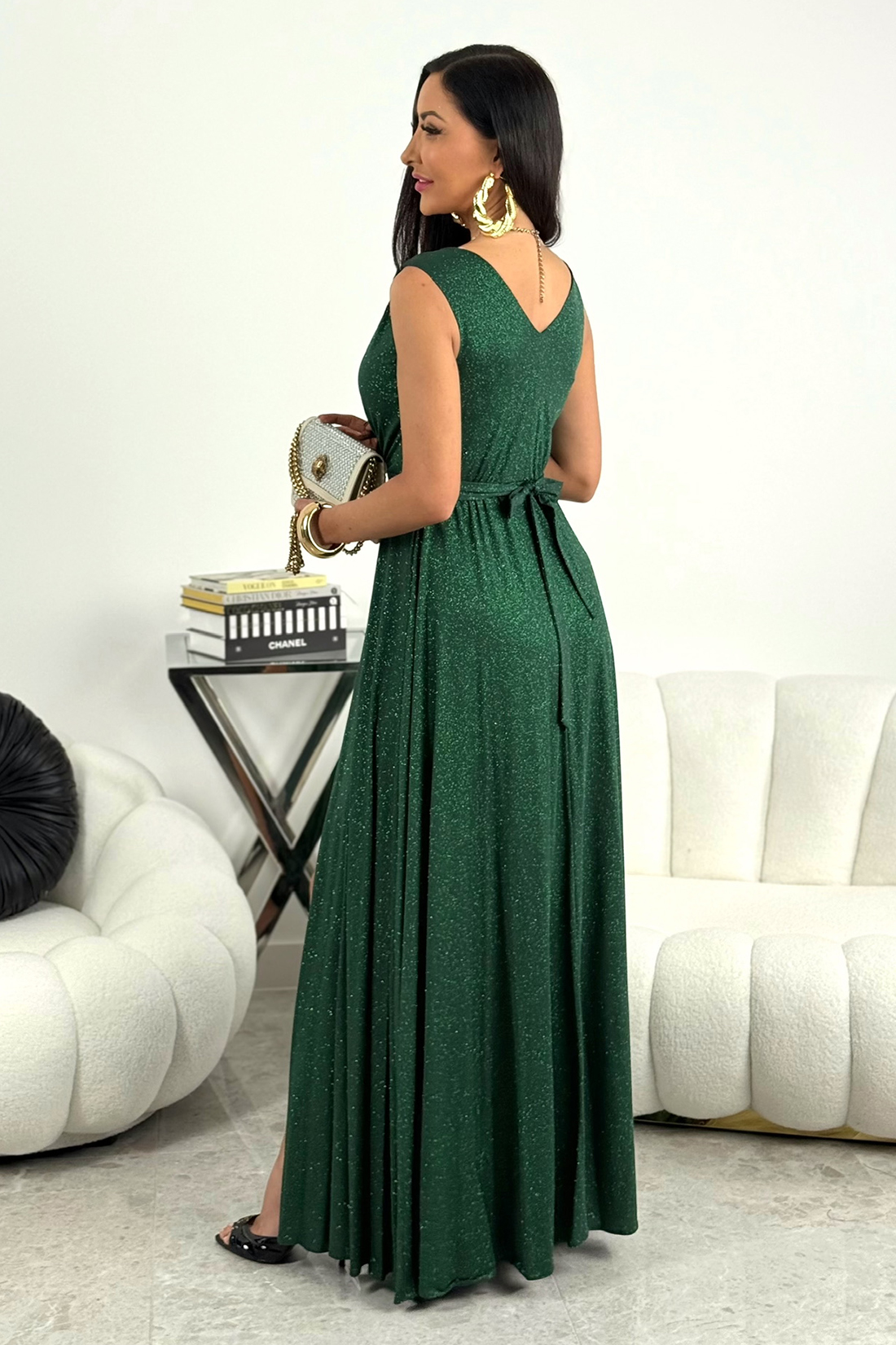 Sukienka wieczorowa SALMA z brokatem to elegancka propozycja dla kobiet, które cenią styl, kobiecość oraz efektowny wygląd. Model wyróżnia się długą, elegancką formą oraz subtelnym połyskiem tkaniny. Dzięki temu stylizacja przyciąga uwagę i doskonale wpisuje się w modę wieczorową.