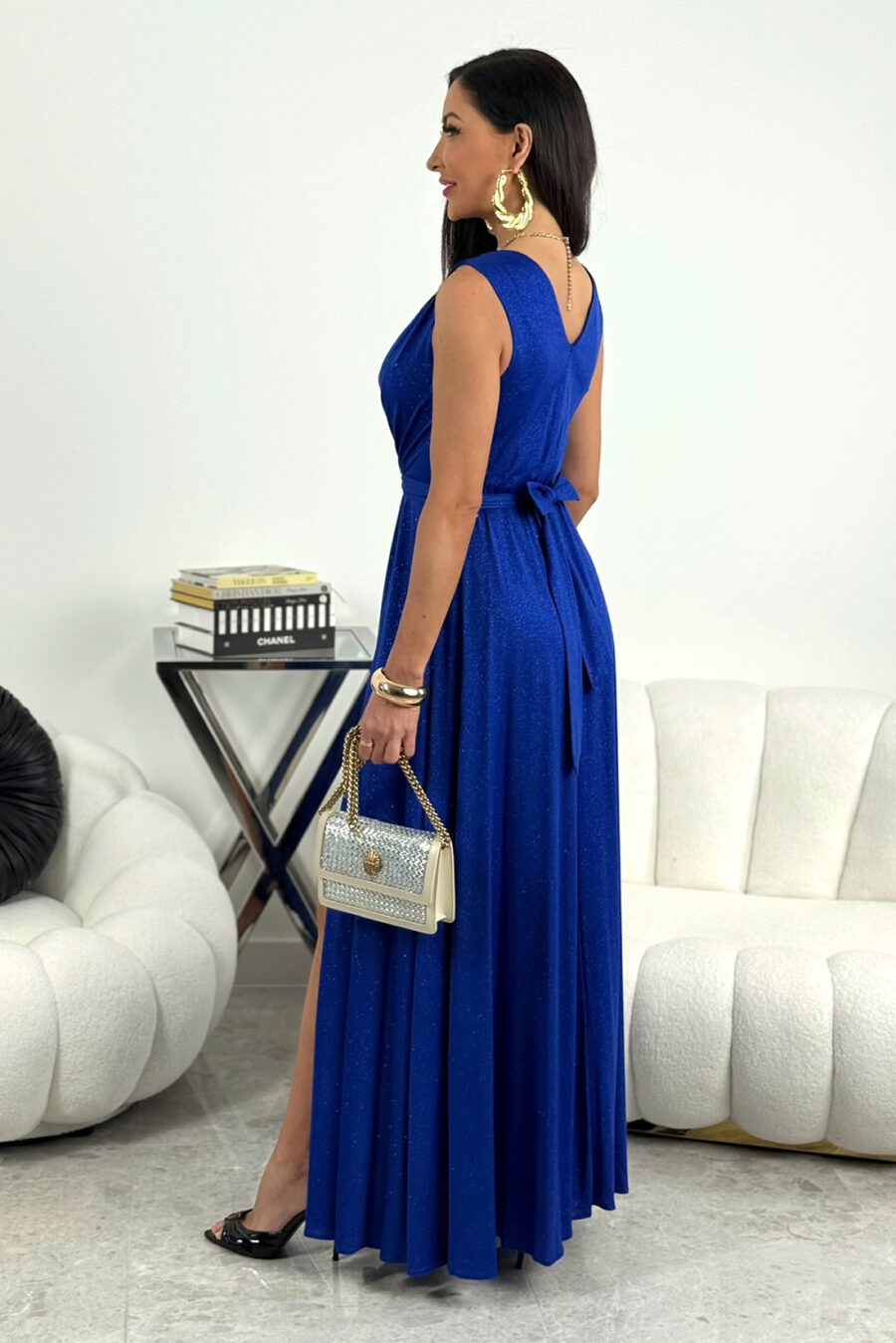 Sukienka wieczorowa SALMA z brokatem to elegancka propozycja dla kobiet, które cenią styl, kobiecość oraz efektowny wygląd. Model wyróżnia się długą, elegancką formą oraz subtelnym połyskiem tkaniny. Dzięki temu stylizacja przyciąga uwagę i doskonale wpisuje się w modę wieczorową.