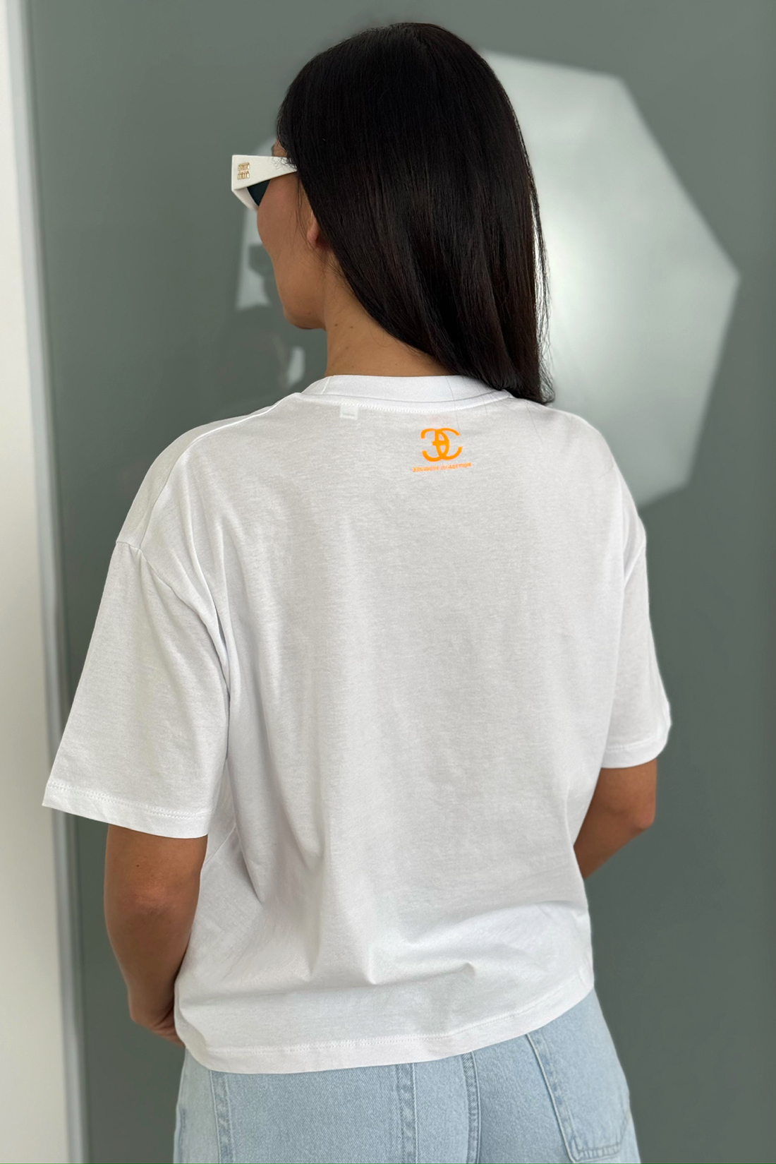 T-shirt damski HEART – biały z pomarańczowym nadrukiem – minimalistyczny styl Urban Glow